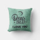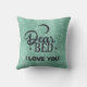 Fun typography style graphic features "Dear Bed, I Love You" text on aqua tint fireflies and faux burlap background
