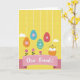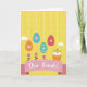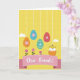 This card features a tall illustration on a soft light-yellow background with a faint plaid texture that feels like early spring. Four decorated egg shapes hang down on thin white lines, their gentle colors—orange, blue, teal, and coral—creating a sweet, friendly rhythm from top to bottom 🌷. Each egg has simple flower motifs and a dashed border, like little gifts suspended in the air. Near the lower right, a tiny yellow chick with rosy cheeks and a small red comb peeks out of a cracked orange shell, leaning forward as if greeting someone close by 🐰. Along the bottom, three stylized pink blossoms with deep green stems rise upward, adding a tender, garden-like touch that suggests togetherness. A curved soft-pink banner stretches across the lower area with a dotted white edge, and the words “Dear Friends!” sit centered in crisp white letters. Small puffy white clouds float in the top corners, balancing the layout with airy space. The hanging eggs are evenly spaced above the banner, and the chick sits just to the right of the flowers beside the broken shell.