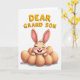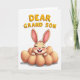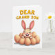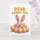On the front of the card a smiling bunny with long ears sits snugly among several smooth, light-brown egg shapes, like it’s being gently tucked in by a caring nest 🐰. The bunny is colored in soft beige with pink accents, and its crinkled eyes, rosy cheeks, and two front teeth give it a sweet, friendly look. The white background keeps the scene airy, drawing attention to the tender expression and the cozy cluster around it. Above the illustration, the words “DEAR GRAND SON” appear in large, raised-looking letters. The text is golden-yellow with a soft orange outline, centered near the top so it feels like it’s watching over the little character. Gentle, diffused lighting adds faint shadows under the eggs, giving the arrangement a calm, close-knit feel like a warm family moment 🌷. The bunny’s ears tilt slightly upward, and the egg shapes form a rounded ring with soft shading along their lower edges.