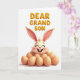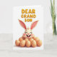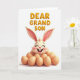 This card shows a smiling rabbit-like character nestled among smooth egg shapes, with eyes closed, rosy cheeks, and two front teeth showing in a grin 🐰. Its long pale ears curve upward with soft pink on the inside, giving the face a gentle, affectionate look. The eggs sit at the bottom like a cozy nest, adding a calm, homey setting that feels made for a close family bond. Across the top, large raised letters spell “DEAR GRANDSON” in a shiny golden color, centered and easy to read. The background stays bright white, keeping the focus on the character and the message. Soft shading under the ears and around the eggs adds depth, like a quiet moment shared between loved ones 🌷. The golden text has a slight gleam, and the eggs look smooth with faint shadows along their edges.