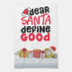 Christmas gifts adorn the bottom of the towel and a fun message above -- Dear Santa, define good. Ha Ha! A beautiful towel that will work hard for you in the kitchen as a kitchen towel or as a decorative piece.