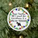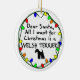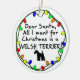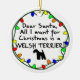 Dear Santa, All I want for Christmas is a Welsh Terrier! Super cute dog lover ornaments, stamps, stickers and more, perfect for including your favorite pet in the holiday season. A colorful string of Xmas lights circles the outside, while a child's note to Santa and his drawing of the dog breed are in the center. Very cute Welsh Terrier design!