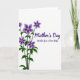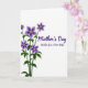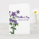 This greeting card features a calm white background with a cluster of five purple flowers rising along the left side, their petals shaded from deep violet to soft lavender at the edges. Each bloom has a small yellow‑green center that feels like a gentle spark, while slim dark‑green stems and leaves curl upward as if reaching toward someone you care about ❤️. The open space on the right gives the flowers room to “lean in,” creating a quiet, affectionate balance like a close companion standing nearby. In the upper right area, the text reads “Mother’s Day Wishes for a Dear Wife,” set in a flowing, cursive-style lettering. The wording appears in a deep purple that matches the blossoms, helping the message feel naturally tied to the bouquet. Soft, even lighting keeps the petals looking smooth and slightly velvety, with no harsh shadows. The arrangement shows five violet blooms on the left, deep green foliage beneath, and purple text in the upper right 🌼.