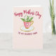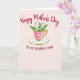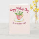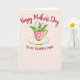 This greeting card features a soft digital illustration with a delicate teacup centered on a pale blush-pink background, setting a gentle, affectionate mood ❤️. The cup is a light pink with thin golden accents along the rim and handle, and a small white heart on its side that hints at close family love. From the teacup rises a fresh cluster of green leaves and small white, bell-shaped flowers, like a quiet spring bouquet arranged with care 🌼. Near the top, the words “Happy Mother’s Day” sit above the artwork in a flowing cursive-style font, colored in a reddish-pink tone. Beneath the teacup, “TO MY DEAREST MIMI” is placed in matching cursive-style lettering, slightly thicker and easy to notice. The spacing keeps the message balanced, with the top line floating lightly while the lower line anchors the design. The flowers arc upward from the cup, with the white bells scattered among the leaves and the gold trim catching the light along the rim.