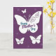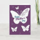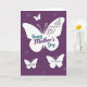 This card shows a deep purple background with a soft grid-like texture, sprinkled with darker purple star-and-flower shapes that feel like gentle sparkles around the scene ❤️. A large white butterfly spreads across the center, and its open wings suggest a tender, affectionate moment, like a quiet embrace captured in silhouette. Curving decorative swirls sit on the upper wings, adding a graceful flourish without crowding the design. Across the middle of the big butterfly, a loving message is placed in teal lettering with a second line in violet, standing out clearly against the white space. Near the top, a smaller white butterfly hovers as if drifting closer, adding to the sense of closeness and connection 🌼. Along the lower edge, two more white butterflies appear in a balanced arrangement, each with a short line of teal or violet text tucked neatly inside. The white shapes glow softly against the rich purple field, and the tiny darker purple motifs scatter like distant petals behind them. In the upper half, the main butterfly’s wings show fine swirl details while the smaller butterfly floats above and the two lower butterflies sit evenly near the bottom border.
