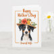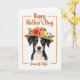 This card features a front-facing portrait of a tri-colored dog with warm brown eyes that seem to meet yours with a gentle, friendly gaze ❤️. Its coat mixes deep black, bright white, and soft russet markings, giving the fur a cozy, plush look. Resting on its head is a simple woven straw-like hat, adding a sweet, homespun touch. Tucked into the hat band is a small bouquet with a deep coral flower, a sunny yellow bloom, and a tiny white blossom, surrounded by fresh green leaves 🌼. The background stays plain white so the dog and flowers feel like the center of attention. A soft orange watercolor-style border frames the scene, like a warm wash around the edges. The phrase “Happy Mother’s Day” sits above the dog in orange lettering, while “Dearest Wife” appears below in the same orange tone. The coral flower on the hat is the largest bloom, angled slightly to one side with green sprigs fanning outward.