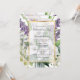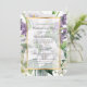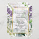 Elegant calla lily photo celebration of life invitation featuring a gold frame adorned with a floral background of purple flowers, calla lilies, orchids and greenery. A floral photo frame at the back.