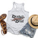 Decaf? Never! Our super cute coffee lovers tank top features "Death Before Decaf" in black gothic typography with a cute skull illustration and a peachy pink ribbon banner.
