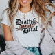 Super cute coffee lovers tee features "Death Before Decaf" in black gothic typography with a cute skull illustration and a peachy pink ribbon banner.