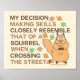 My decision making skills closely resemble that of a squirrel when crossing the street. Funny saying typography with a cute confused squirrel graphic with acorns and oak leaves in brown, orange and green.