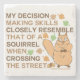 My decision making skills closely resemble that of a squirrel when crossing the street. Funny saying typography with a cute confused squirrel graphic with acorns and oak leaves in brown, orange and green.