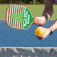 Deck the Balls! A funny holiday play on words. Pickleball for your family Christmas or holiday get-togethers where everyone gathers around the pickleball court. . A festive pickleball paddle with a decorated Christmas tree and candy cane striped background. Make your competitors laugh while destroying them with your game.