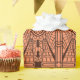 Wrapping paper in a geometric pattern based on Art Deco architectural details - dark chocolate brown on a copper / rust background