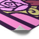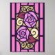 Stained glass art deco rose design in pink, light olive, pale yellow, lilac and dusty rose with dark dusty purple leading.