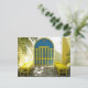 Decorated blue door with yellow benches postcard