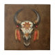 This unique design features a symmetrical bull skull with four feathers attached to the horns. Rough textures and natural colors gives the graphic a realistic look. The skull is decorated with native patterns including a stylized star in the center of the forehead. The skull sits on a textured background that gives the pattern an aged leather look. This aggressive skull design is a stunning and unique Native American design.