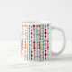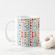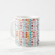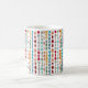 This mug has a mid-century modern design of circles and ovals strung together in retro colors strung together on a field of white.