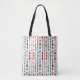 This tote bag has a mid-century modern design of circles and ovals strung together in retro colors strung together on a field of white.