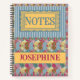 A bright folk art design feature intricately detailed tickets filled with various flower designs and interspersed with quatrefoil solids and patterns is bordered by a smaller version of the same. The pronouncement, "Notes", is ornately framed with a bright yellow lace border backed by blue stripes.