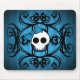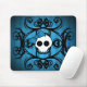 Super cute hand drawn Gothic skull mouse pad with a thorny swirly vine motif in black on a background of blue stripes. A Pretty desk decoration.