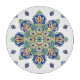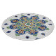 This 12" Round glass cutting board has an intricate multicolored Medallion. The colors are blue, green and tan on a white background. Look for other coordinating products in the Collection. This design comes from tiles by Oregon Tile maker Fay Jones Day.