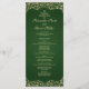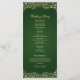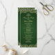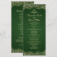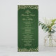 This wedding program design radiates timeless elegance with its rich green background paired with ornate golden damask details. The front side presents the full wedding program framed by intricate gold flourishes on a deep green panel, creating a luxurious and regal look. On the back, the couple’s names are highlighted within a circular golden damask frame, perfectly blending sophistication and celebration. The green and gold combination offers a classic yet striking style, ideal for formal wedding ceremonies..02