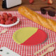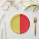 This paper plate has yellow on one side and red on the other side.