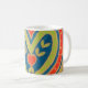 A white coffee mug with a decorative heart design in red, blue, green and gold from a watercolour painting by Judy Adamson.