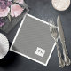 A bold, decorative font immediately catches your eye and sets the tone for most pieces of this modern, minimalist wedding suite. The wedding paper napkin shown here features an optional, diagonal pinstripe backdrop for your initials and wedding date. A heart-accented ampersand adds a unique finishing touch. Search ID887 to see all the products in this wedding set.