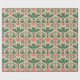 Decorative paper with a pattern of stylized green leaves and pink flowers on a white background, shown rolled and flat. Bright and lively design.