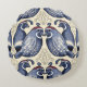 Round accent pillow with a design of beautiful quail birds and decorative elements on a light creamy yellow background. Reverse side is solid navy blue.