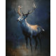 This painting showcases a stately deer with 11-point antlers, symbolizing strength and maturity. The deer's posture is poised and alert, suggesting a deep awareness of its surroundings. Its fur is richly textured, with warm brown tones illuminated by subtle, moody lighting. The background features a dramatic blend of deep blues and grays, creating a stark contrast that highlights the deer's silhouette. The antlers, stretching high and wide, are the centerpiece—each tine crisply defined and evocative of nature’s raw artistry. The overall effect is powerful yet serene, capturing a perfect balance of wilderness majesty and artistic expression. Whispers of the Wild