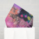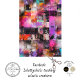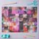 The image is an abstract artwork composed of a grid of squares, each filled with various colors, textures, and patterns. The colors range from vibrant pinks, purples, and oranges to darker shades of black and gray. Some squares feature splatters and streaks of paint, while others have geometric patterns or textured surfaces. The overall effect is a visually dynamic and chaotic composition, with a mix of organic and structured elements.