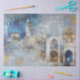 The image is a detailed and artistic painting that depicts a blend of architectural elements from Islamic architecture. It features domes, minarets, and intricately designed arches, showcasing the beauty and complexity of Islamic art and architecture. The painting uses a mix of cool and warm tones, with blue and gold being prominent, creating a visually striking contrast. The use of texture and abstract elements adds depth and interest to the composition, making it a captivating piece of art.