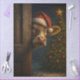 This curly-haired cow is bringing the holiday cheer—one peek at a time. Dressed in a classic red Santa hat with fluffy trim, she peeks out from behind a weathered wooden door as snow gently falls around her. In the background, a glowing Christmas tree sparkles with golden lights and ornaments, adding warmth and wonder to this rustic winter scene.