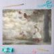 A full portrait shot depicts a young girl dressed in a winter coat, a wooly hat, and boots, walking along a faint path in a field of flowers. The girl has fair skin and long blonde hair that falls down her back. She wears a beige knit hat and a cream-colored coat with russet floral patterns. Her russet-colored boots are shiny. As she walks, she looks to the left of frame at a cluster of small, crimson flowers in a light brown patch of grass that line a faint gray path along the bottom of frame. Above the flowers, three detailed butterflies are suspended mid-flight. Two of the butterflies are painted with similar shades of red, with white geometric shapes and spots painted across their wings. The third butterfly is colored with both tan and red hues. Bare branches extend into frame from the top right and top left corners of the shot.