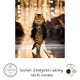 The image shows a cat walking down a runway, similar to a fashion show. The cat is wearing an elaborate outfit that includes a black, feathered garment with shiny, sequined details. The background is filled with blurred lights, giving the scene a glamorous and high-fashion atmosphere. The audience is visible on either side of the runway, adding to the impression of a fashion show setting. This image is interesting and relevant because it humorously combines elements of high fashion with an unexpected model, a cat, creating a visually striking and amusing scene.