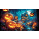 Enter a twilight world where jack-o’-lanterns flicker like sentinels and a haunted house looms in gothic splendor. This atmospheric design features glowing pumpkins with expressive faces lining a misty path, leading straight to an eerie manor crowned by turrets and glowing windows. Bats swirl above a full moon, while twisted trees stretch like curious spectators over golden leaves.