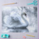 The image shows a graceful white swan with its wings partially spread, gliding on a calm body of water. The background is ethereal, with soft, blurred elements that resemble reeds and flowers, creating a dreamy and serene atmosphere. The swan's reflection is visible in the water, adding to the tranquility of the scene. This image is interesting and relevant due to its depiction of natural beauty and elegance, often symbolizing purity and grace.