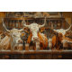 The image humorously depicts three cows standing behind a bar counter, each with a frothy drink, possibly milkshakes, in front of them. The cows have distinctive large horns and wear ear tags, adding a touch of personality to their appearance. Behind them, shelves stocked with bottles of alcohol set the backdrop, suggesting a whimsical bar scene. The concept blends human-like behavior with farm animals, creating a playful and surreal visual.