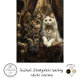 The image shows two cats sitting on an ornate, luxurious chair. The cat on the left is a tabby with a fluffy coat and striking green eyes, adorned with elaborate jewelry featuring pearls and gemstones. The cat on the right is a white cat, also wearing intricate jewelry with pearls and gemstones. The background is richly decorated with gold and intricate patterns, adding to the opulent setting. This image is interesting due to the juxtaposition of the regal, human-like adornments on the cats, creating a whimsical and luxurious scene.