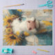 This vibrant mixed-media decoupage design features a whimsical cow with a white face and pink nose, adorned with a flower crown of sunflowers and other small blossoms. The cow's fur blends into a collage-style background, incorporating blue and yellow paint patches, text fragments, and textured artistic elements.