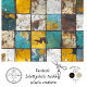 This distressed tile-patterned decoupage background features a grid of square tiles in shades of turquoise, yellow, white, and brown, each with a weathered and rustic texture. The cracked, chipped, and worn surfaces give the design a vintage, antique appeal, making it ideal for creative projects, shabby-chic decor, and mixed-media crafts.