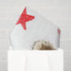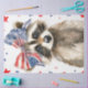 This delightful watercolor-style image features a raccoon front and center, donning a large patriotic bow atop its head. The bow boldly displays the American flag motif—red and white stripes on one side, blue with white stars on the other—offering a whimsical nod to national pride. The raccoon gazes outward with curious, endearing eyes, its soft fur painted in gentle brushstrokes that enhance its expressive charm. Scattered behind it, festive red, blue, and pink stars of various sizes float across a pale background, adding energy and celebration to the scene. It’s a sweet and spirited portrait—equal parts adorable and all-American.