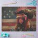 This photo features a patriotic rooster wearing a cowboy hat against the backdrop of an American flag. The rooster's proud expression and the vibrant colors of the flag create a lively and patriotic image. This digital artwork is a playful and creative take on American patriotism.