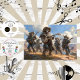 This surreal panel captures five skeleton cowboys mid-performance in a sweeping desert landscape, each strumming guitars and banjos with ghostly flair. Dressed in tattered Western gear—wide-brimmed hats, boots, and bandanas—they stand on a grassy plateau surrounded by mesas, rock formations, and a winding river. A lone white bison watches from the distance, adding depth and mystery to the scene. With dramatic clouds overhead and a haunting sense of rhythm, this piece blends outlaw folklore with supernatural storytelling.