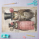 The image shows two anthropomorphic owls dressed in vintage and steampunk-inspired attire. The owl on the left is wearing a pink shirt with a ruffled collar and a black top hat adorned with a pink rose. The owl on the right is dressed in a more natural feathered look but accessorized with various gears and medals, also wearing a black top hat with a pink rose. The background features handwritten text, a clock, and gears, adding to the whimsical and artistic nature of the illustration. This image is interesting due to its creative and detailed depiction of owls in human-like clothing and accessories, blending elements of fashion, art, and steampunk design.