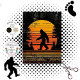 Sunset Bigfoot decoupage paper design, forest silhouette creature craft sheet, orange yellow sky journal cover, retro folklore themed media art, walking Sasquatch pine tree backdrop, RHDesigns exclusive mythical creature paper, wilderness sunset mixed media sheet, bold gradient sky forest design, legendary cryptid nature craft paper, stylized Bigfoot sunset scene art.