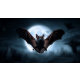 This image captures a dramatic and moody nighttime scene featuring a bat flying directly toward the viewer. Its expansive wings are fully outstretched, revealing intricate textures and veining illuminated by a luminous full moon behind it. The bat’s face is clearly visible, ears alert, with a piercing and intense gaze. Surrounding the central figure, silhouettes of other bats flutter through a shadowy night sky above a haunting forest skyline. The contrast between the glowing moonlight and the dark, ambient background evokes a cinematic and slightly eerie atmosphere—perfect for gothic, nocturnal, or Halloween-themed artwork.