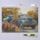An enchanting scene featuring an old rusty truck parked on a country road, accompanied by a striking blue highland cow. The truck’s bed is filled with vibrant flowers in full bloom, adding a burst of color to the rustic setting. The warm tones and foliage in the background suggest an autumn day, creating a picturesque rural landscape. These designs are created by RHDesigns of 2chattychicks for use with decoupage tissue paper, perfect for enhancing furniture, scrapbooking projects, canvas artwork, poster art, and home decor